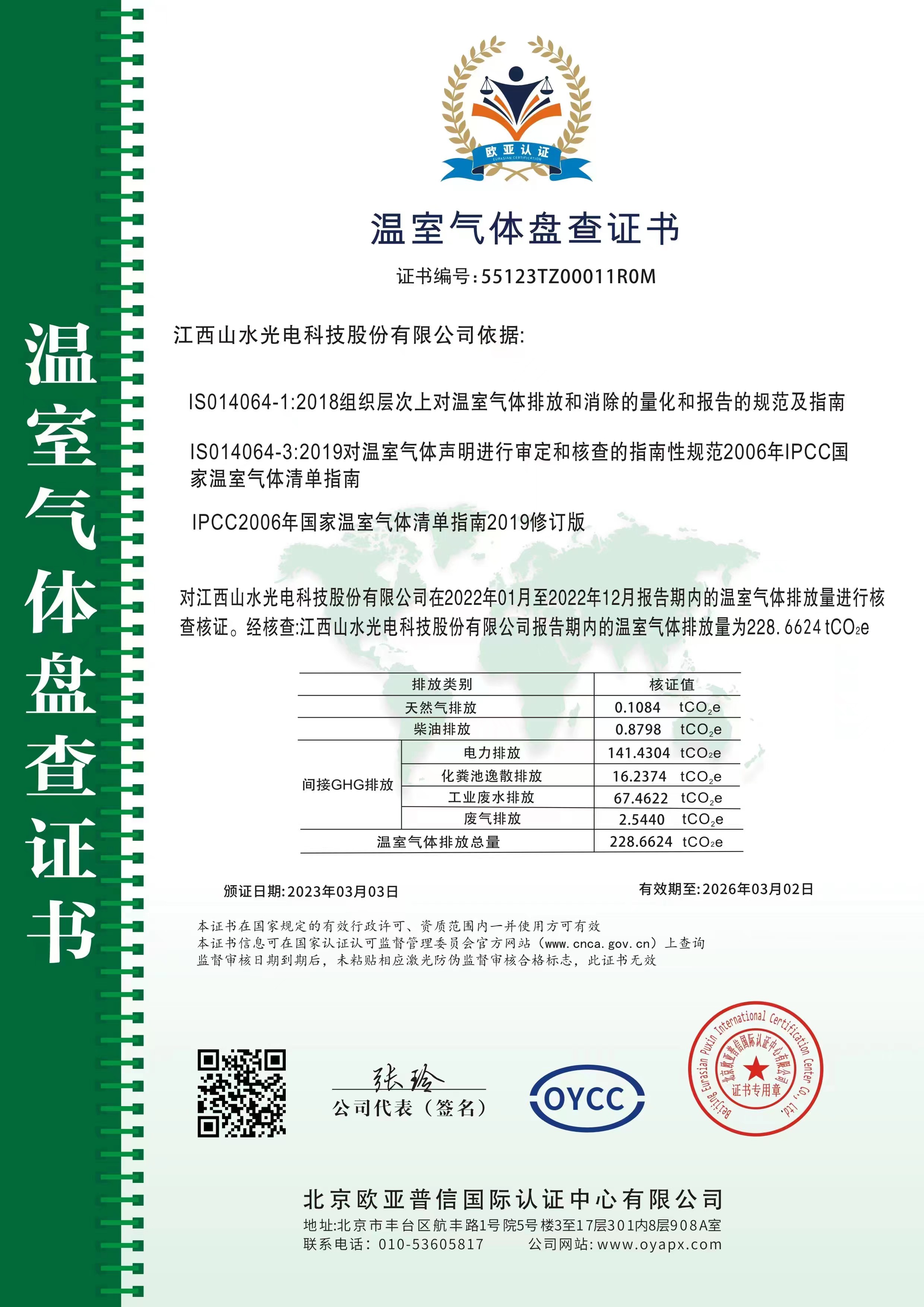 江西山水光電科技股份有限公司2022年度碳排放信息已通過北京歐亞普信國際認證中心核查并認證,相關(guān)證書見附件。