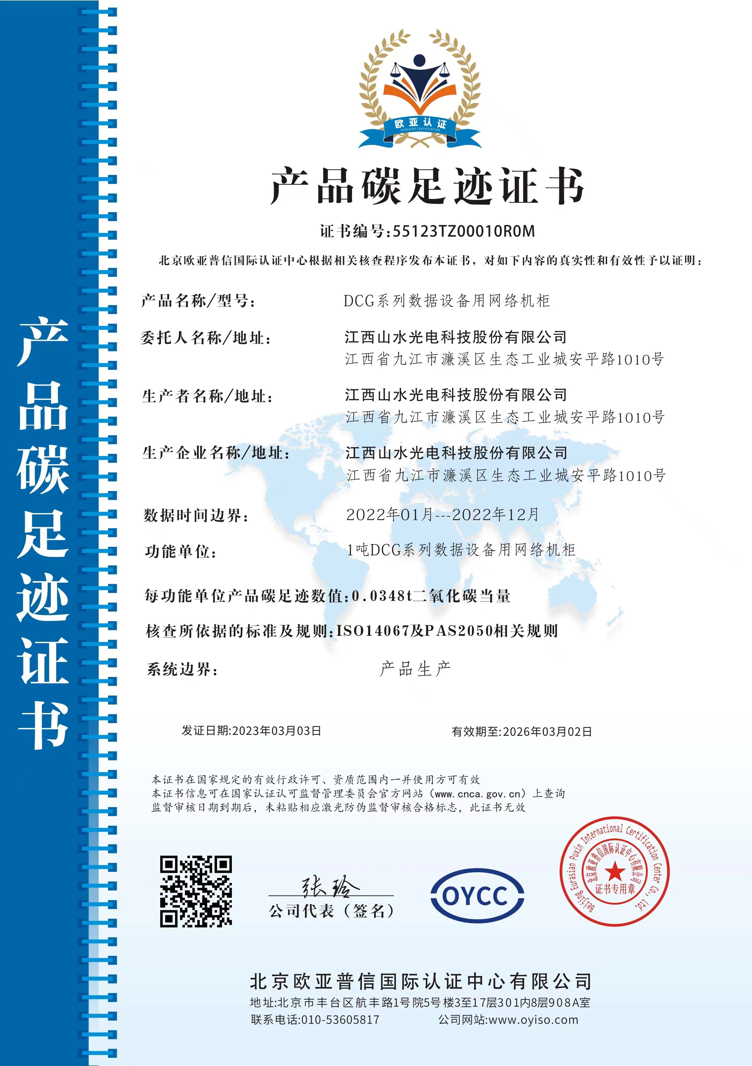 江西山水光電科技股份有限公司2022年度網(wǎng)絡(luò)機柜碳足跡已通過北京歐亞普信國際認證中心核查并認證,相關(guān)證書見附件。