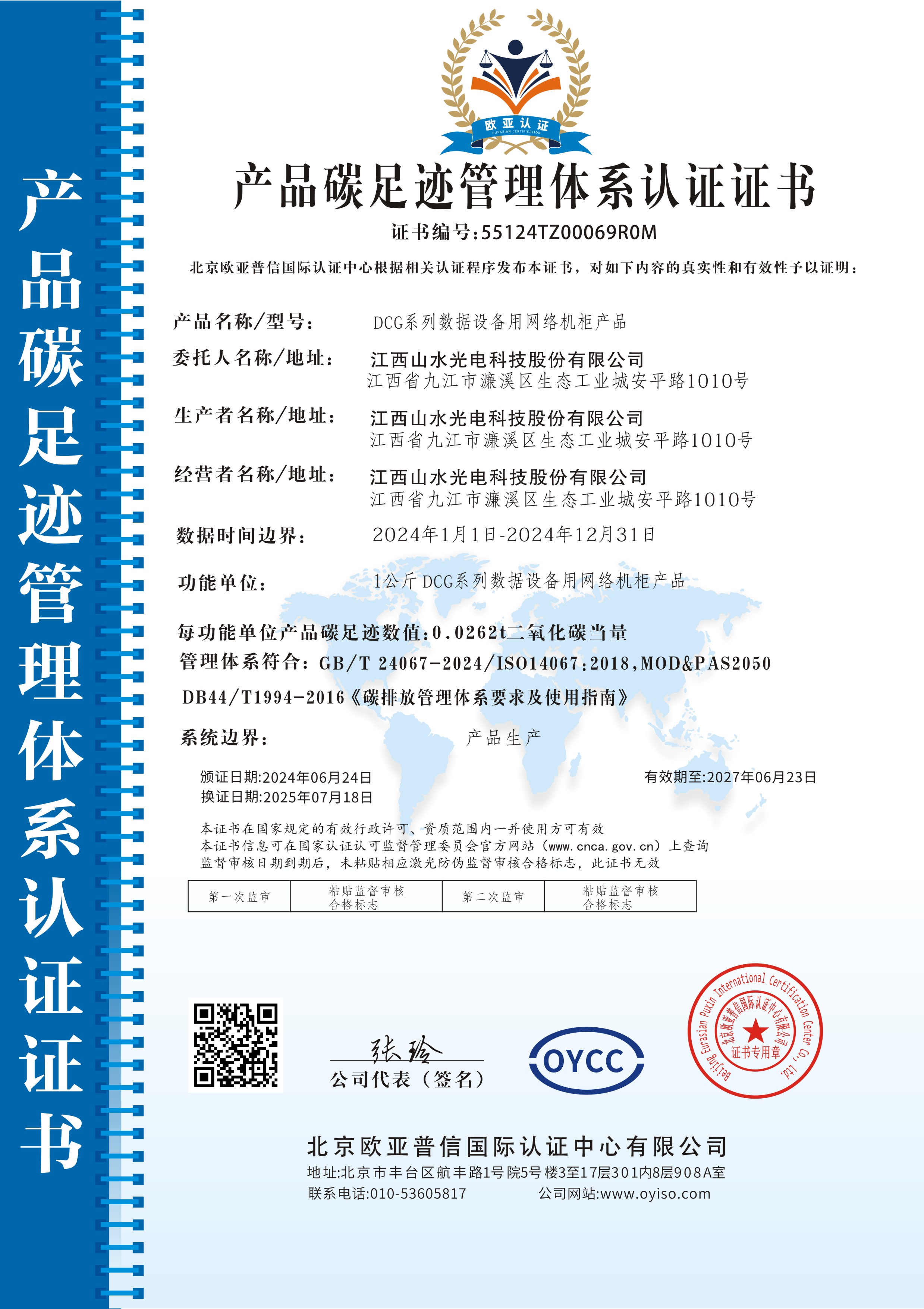 江西山水光電科技股份有限公司2024年度網(wǎng)絡(luò)機柜碳足跡已通過北京歐亞普信國際認(rèn)證中心核查并認(rèn)證,相關(guān)證書見附件: